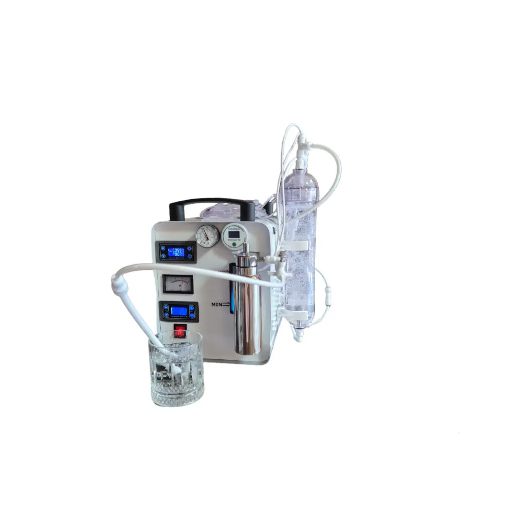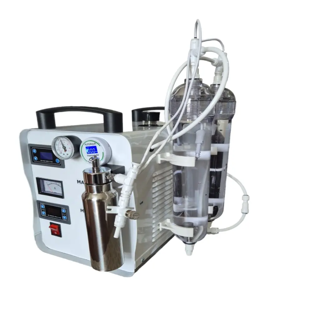 Prezentujemy najnowszą, udoskonaloną wersję generatora H700, który produkuje wodór, tlen (gaz Browna) oraz elektrycznie rozprężoną wodę (ExW). Urządzenie osiąga wydajność około 1 litra gazu Browna na minutę, w tym 667 ml wodoru i 333 ml tlenu, co umożliwia efektywną inhalację dla dwóch osób jednocześnie lub jednoczesne inhalowanie jednej osoby i nasycanie wody wodorem. Dzięki regulacji mocy w zakresie od 0% do 100%, urządzenie jest bezpieczne w użyciu nawet dla osób z mniejszą pojemnością płuc.