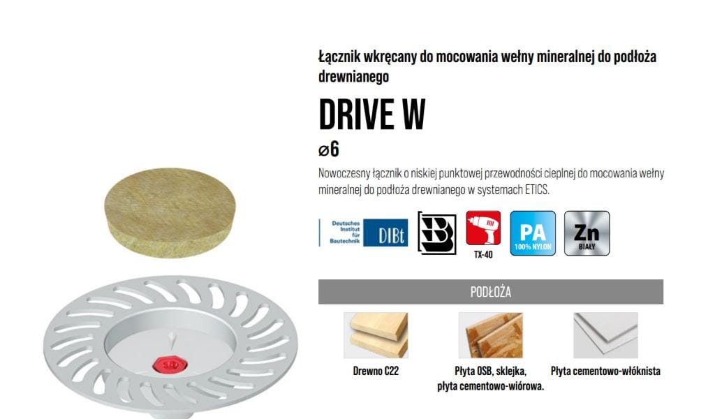 DRIVE-W Łącznik wkręcany do mocowania wełny mineralnej do podłoża drewnianego