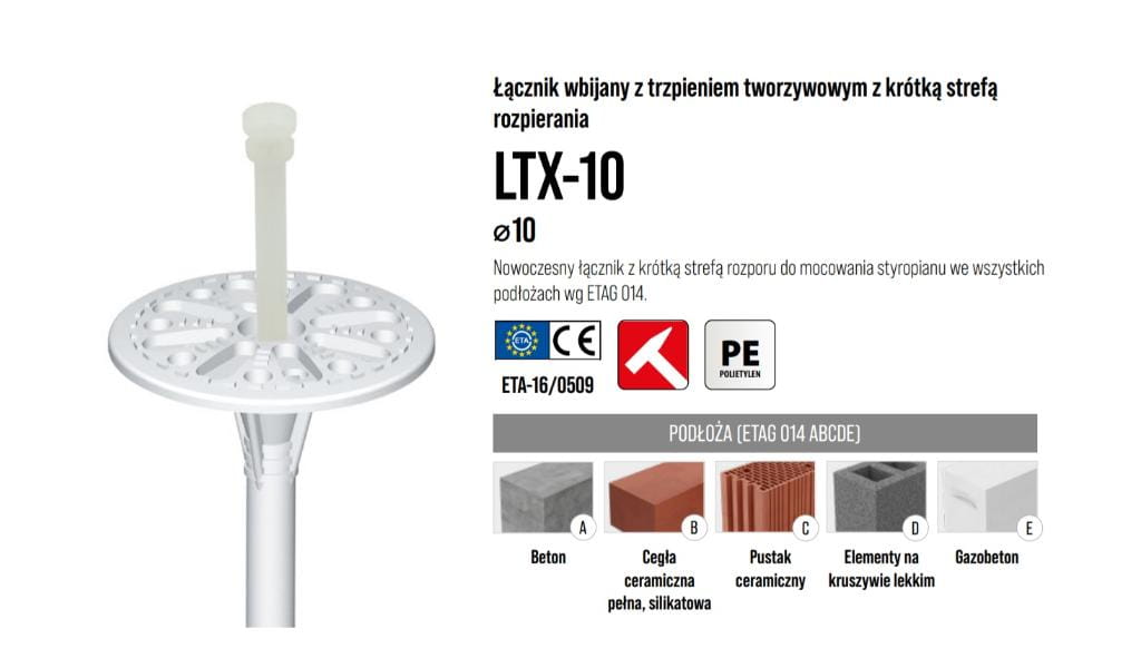 - Łącznik tworzywowy do mocowania styropianu we wszystkich podłożach wg ETAG 014, w systemach ETICS