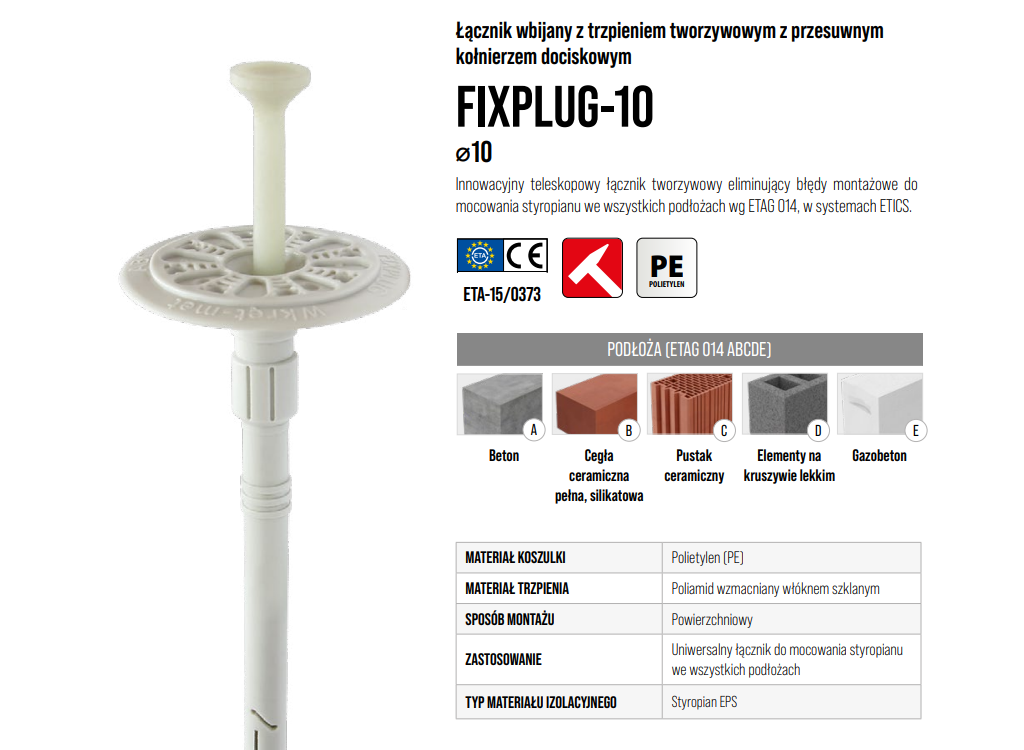 - Innowacyjny teleskopowy łącznik tworzywowy eliminujący błędy montażowe do mocowania styropianu we wszystkich podłożach wg ETAG 014, w systemach ETICS